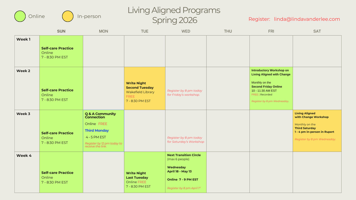 NOTE: Registration closes by 8 pm the preceding Wednesday of each workshop.